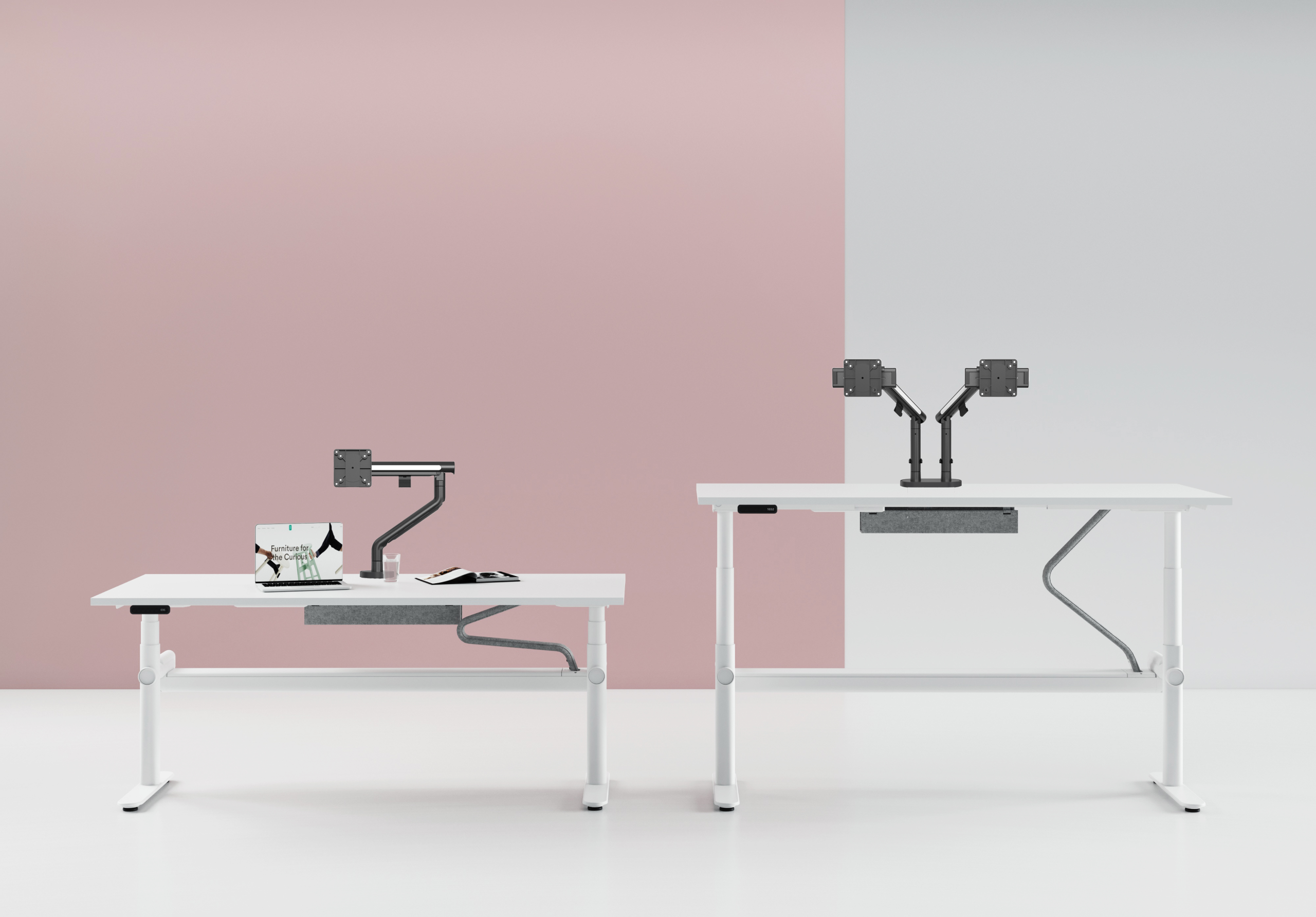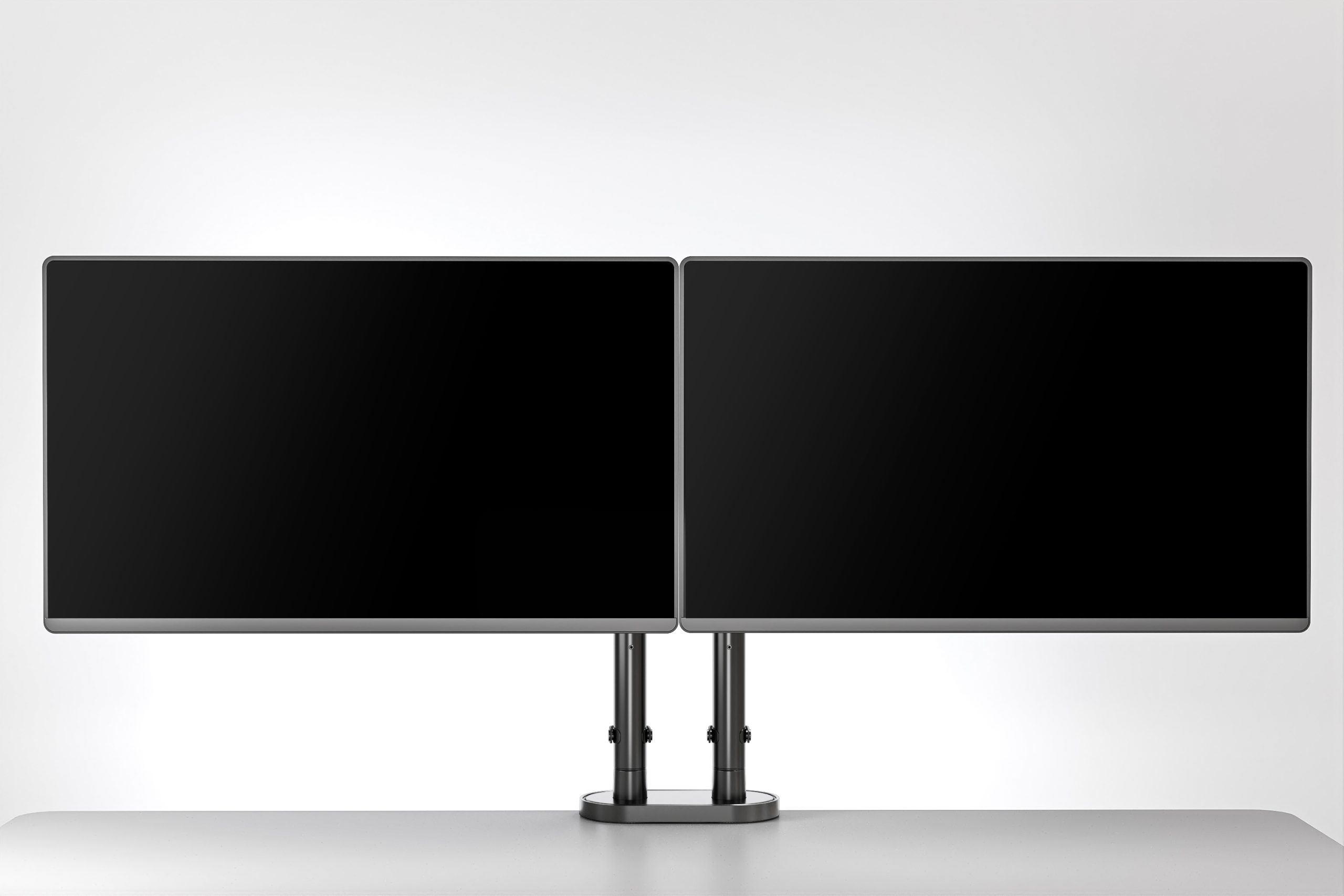 The double arm features two stage gliding runner technology allowing for perfect side by side positioning, regardless of monitors, while also providing a generous viewing distance for better ergonomic comfort.
