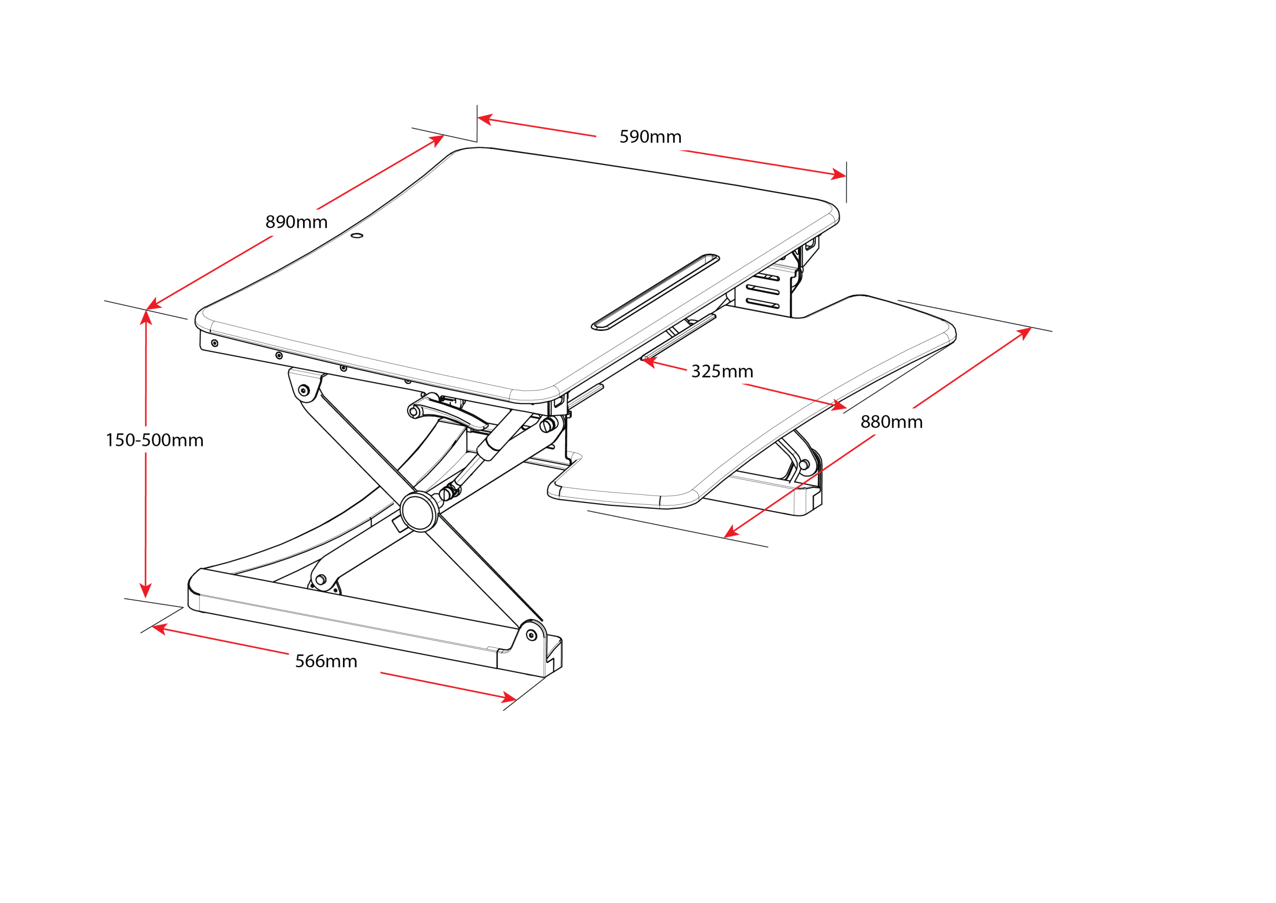 With a large keyboard tray and wide work surface, gas spring height adjustment via control levers on either side allows 15 height adjustment levels.