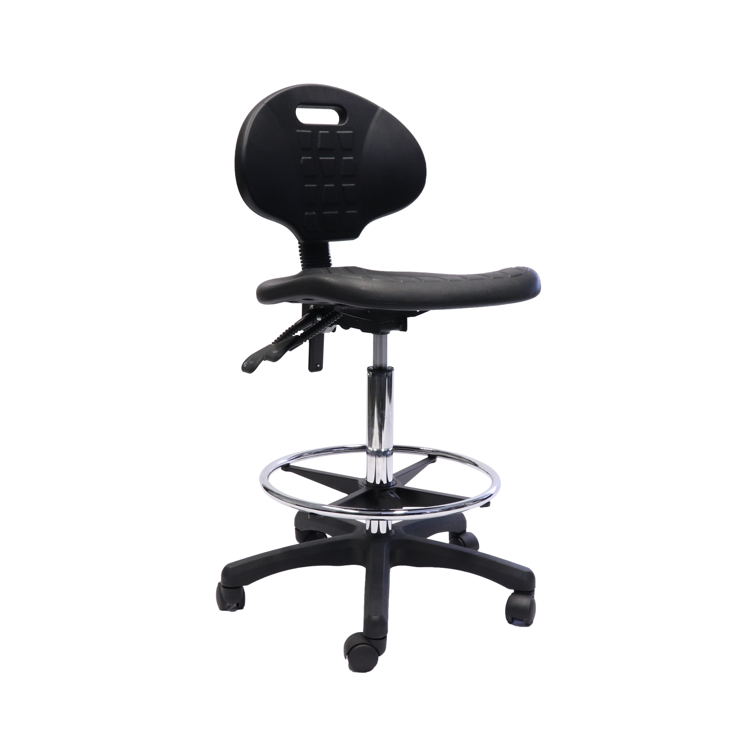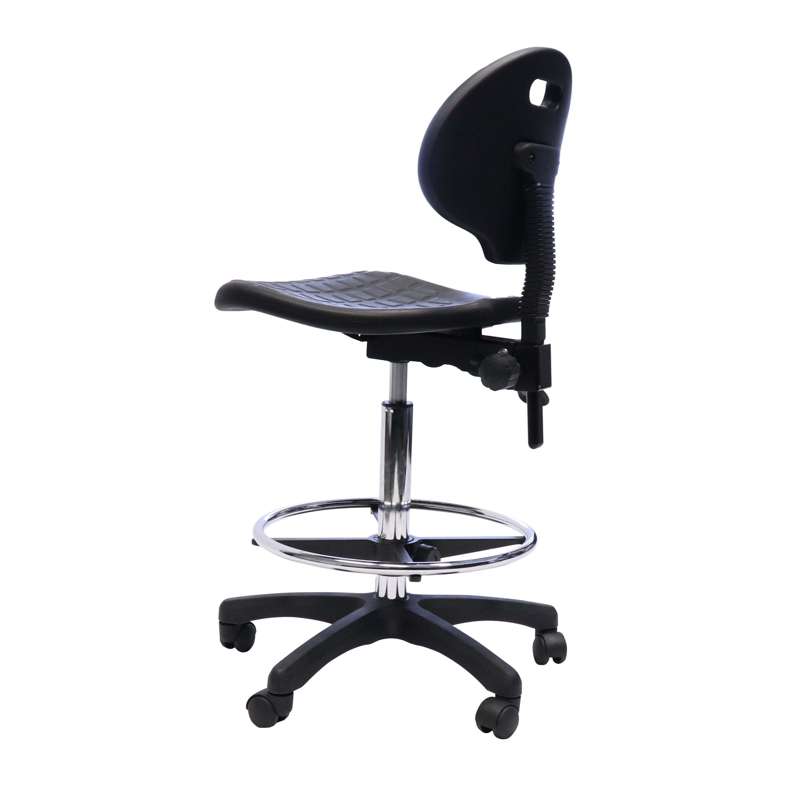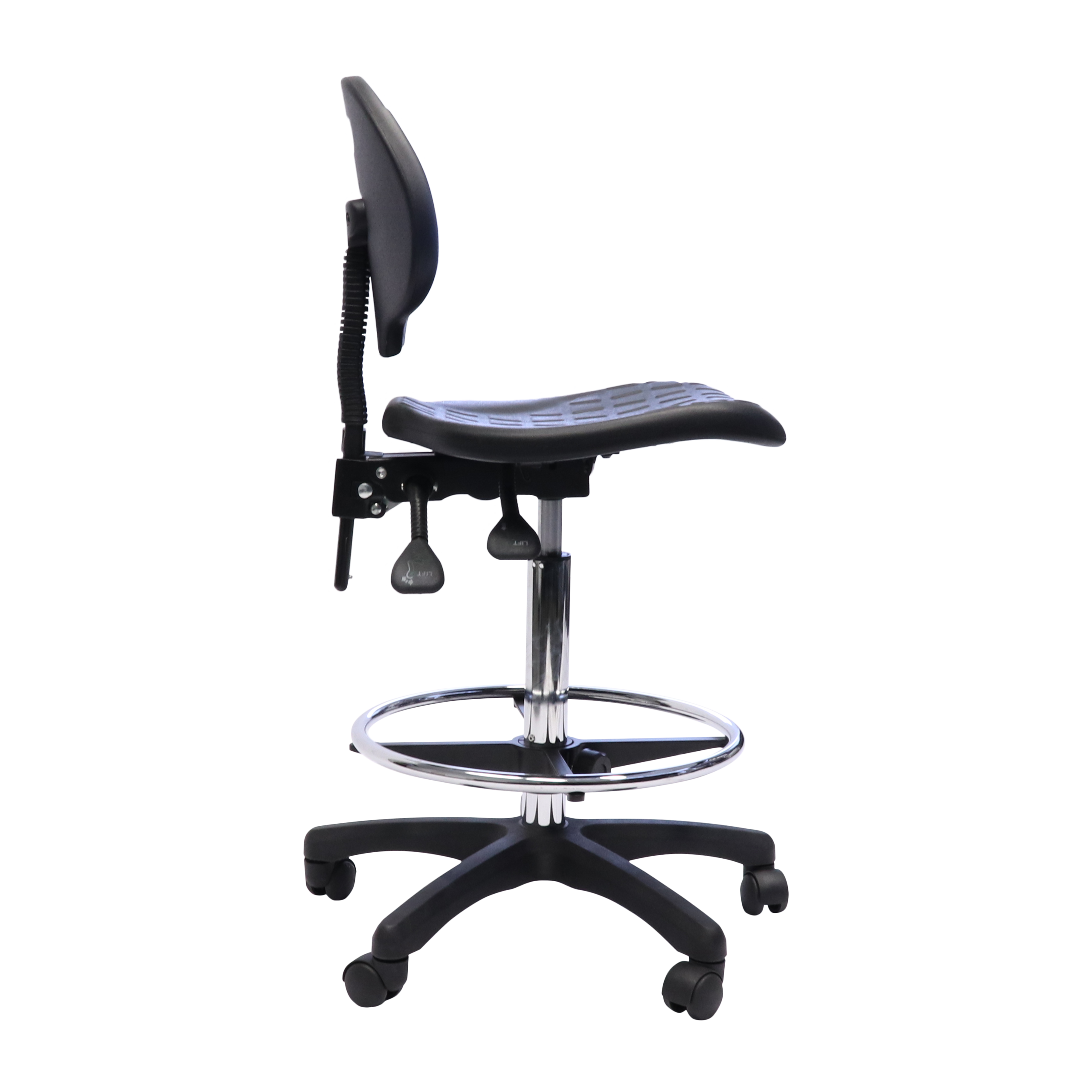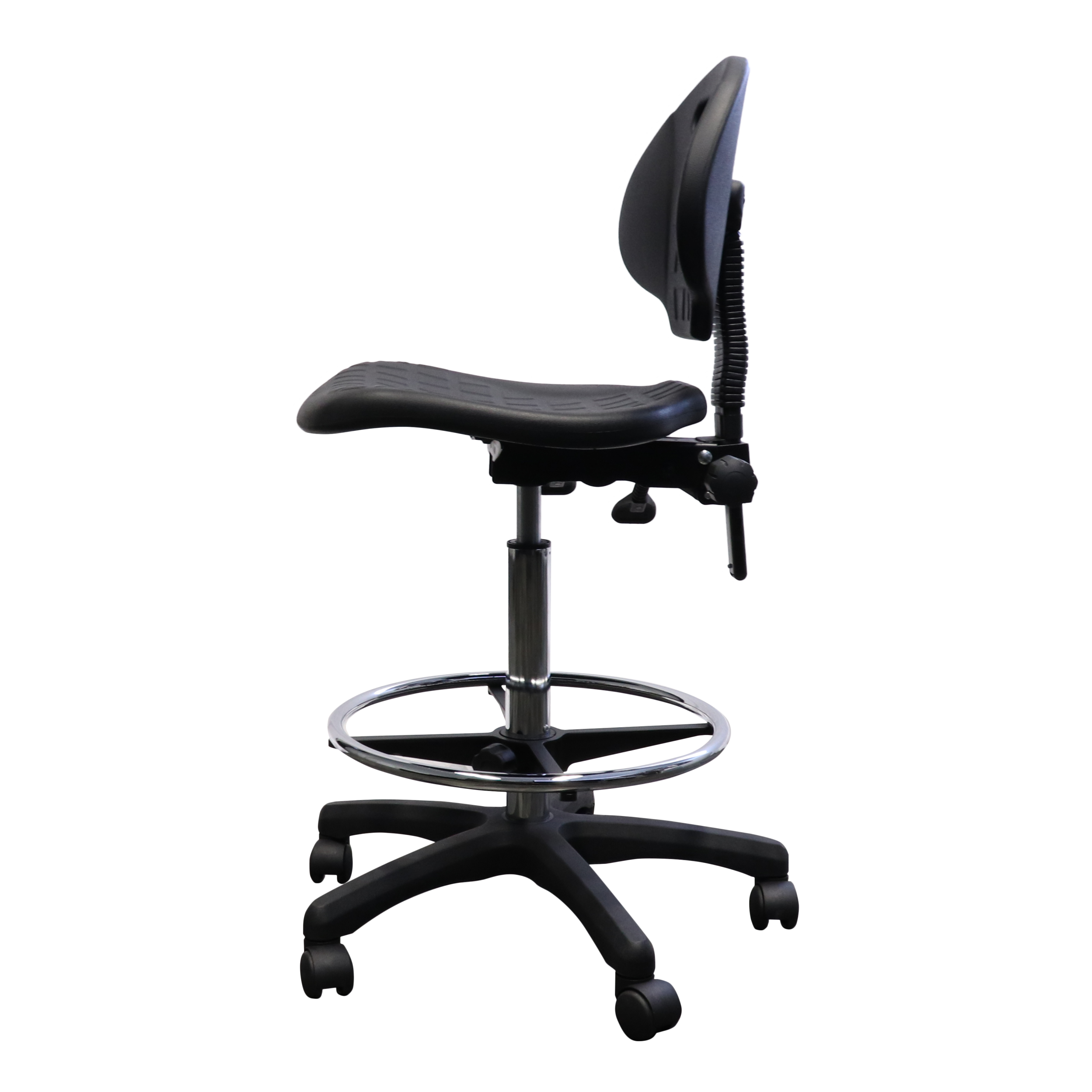 The Rapidline Laboratory Drafting Stool features a moulded polyurethane seat pan and back rest, contoured waterfall seat and infinite tilt lock for flexible seat adjustment.