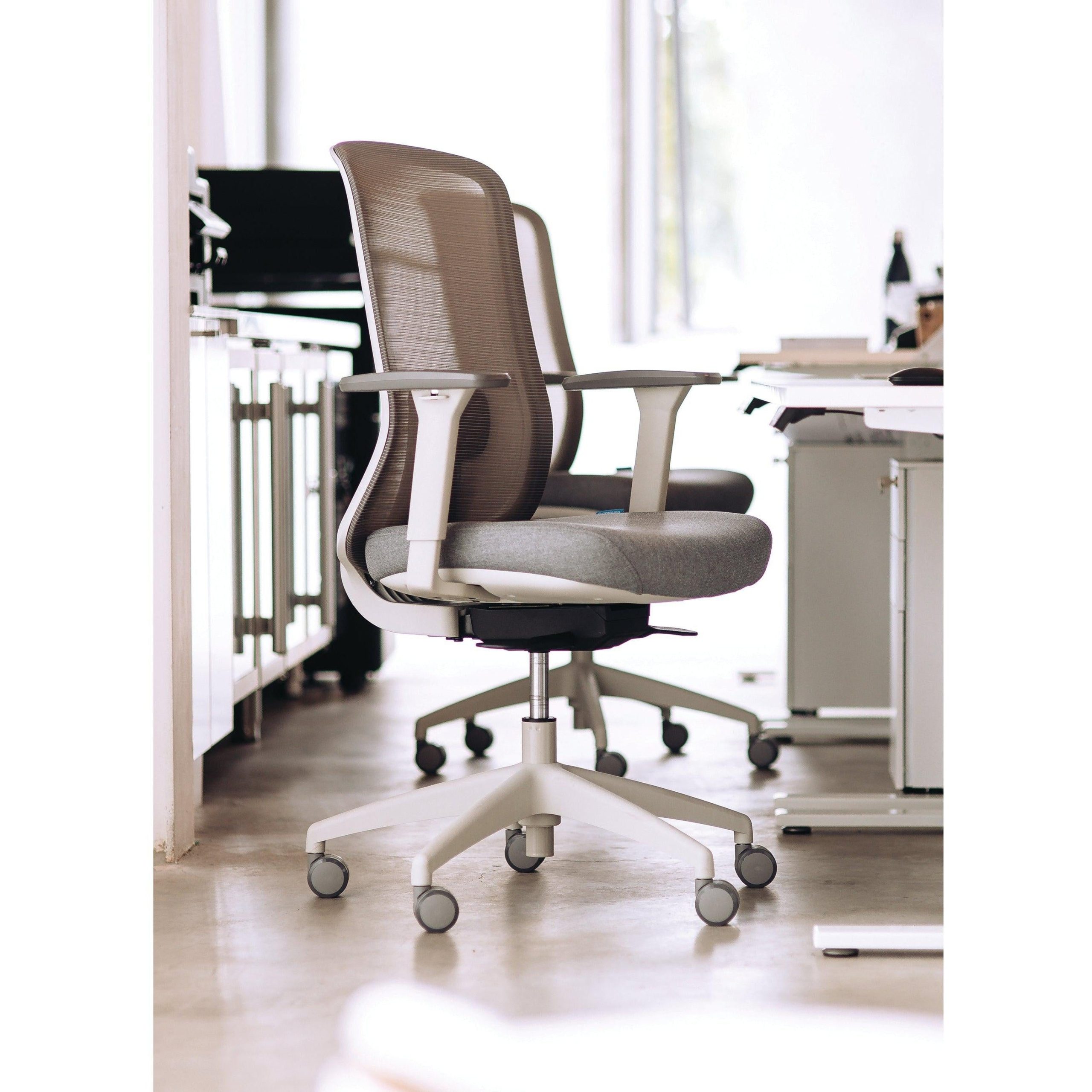 The Buro Elan is an office chair with a graceful appearance, elegant lines and advanced ergonomic features including a synchro mechanism, breathable mesh back, depth adjustable seat slide, armrests, headrest, lumbar support and optional headrest. Choose from a black or light grey frame to complement the workplace or home office interior.