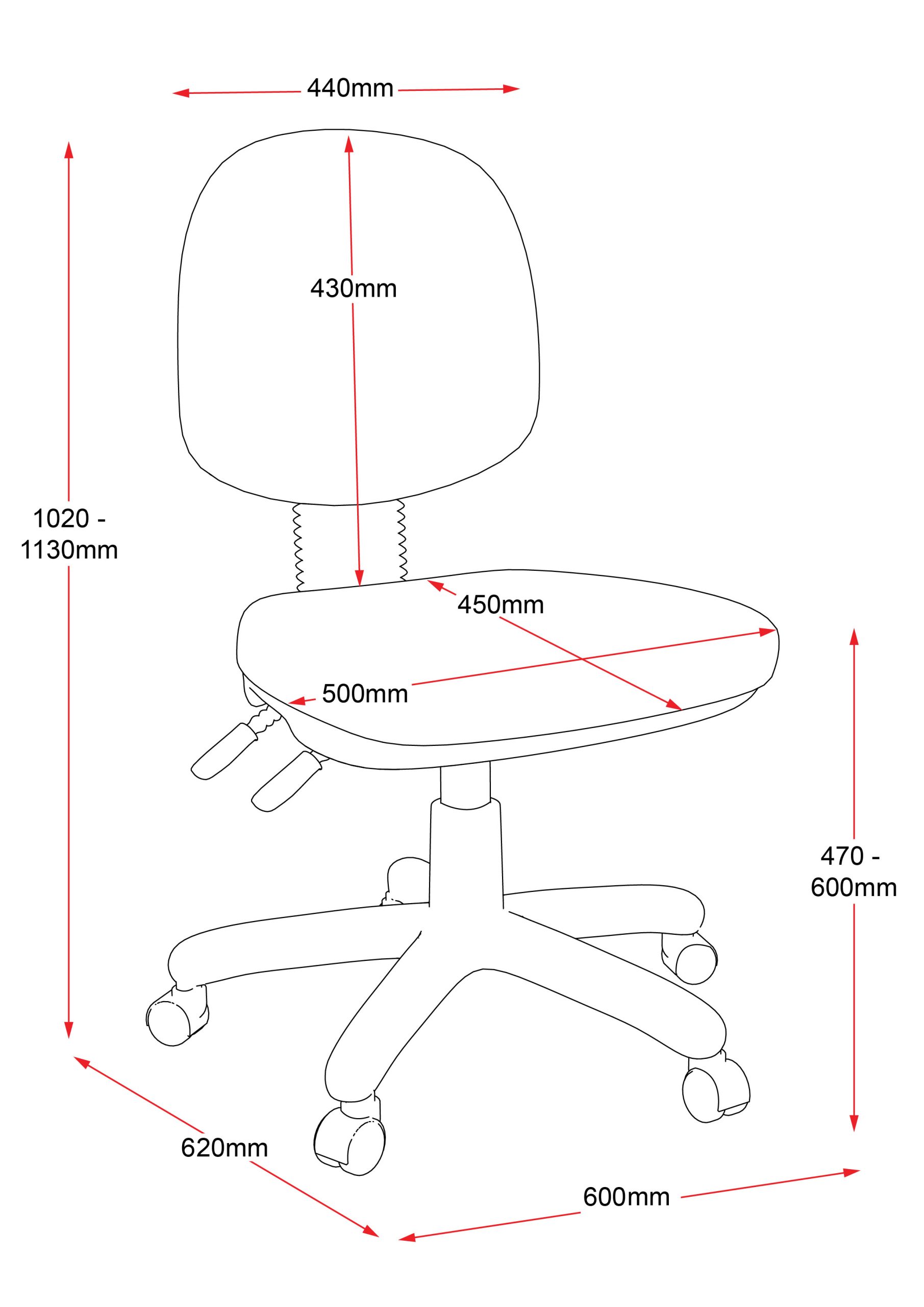 | Dimensions | 600mm (W) x 620mm (D) x 1020-1130mm (H) Seat height: 470-600mm |