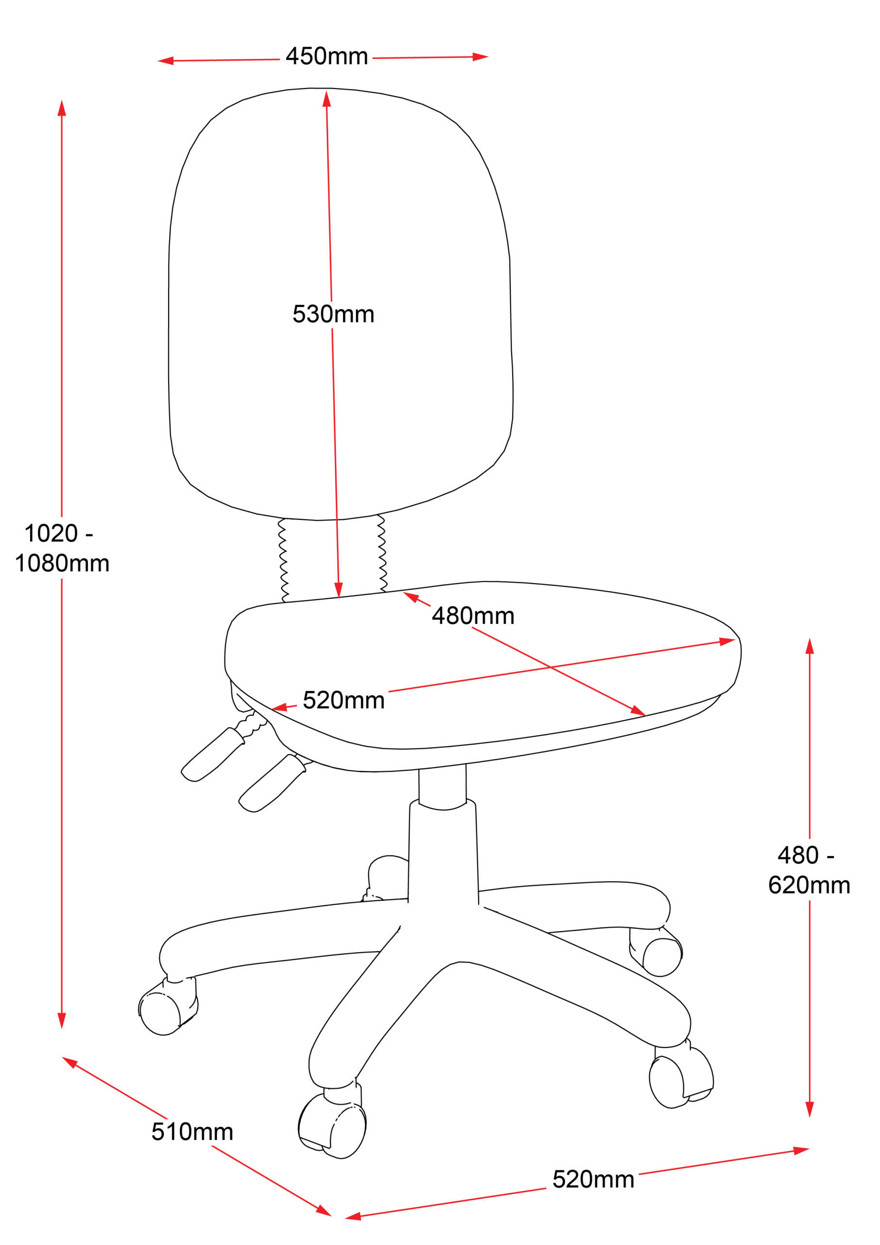 | Dimensions | 520mm(W) x 510mm(D) x 1020-1080mm(H) Seat Height: 480-620mm |