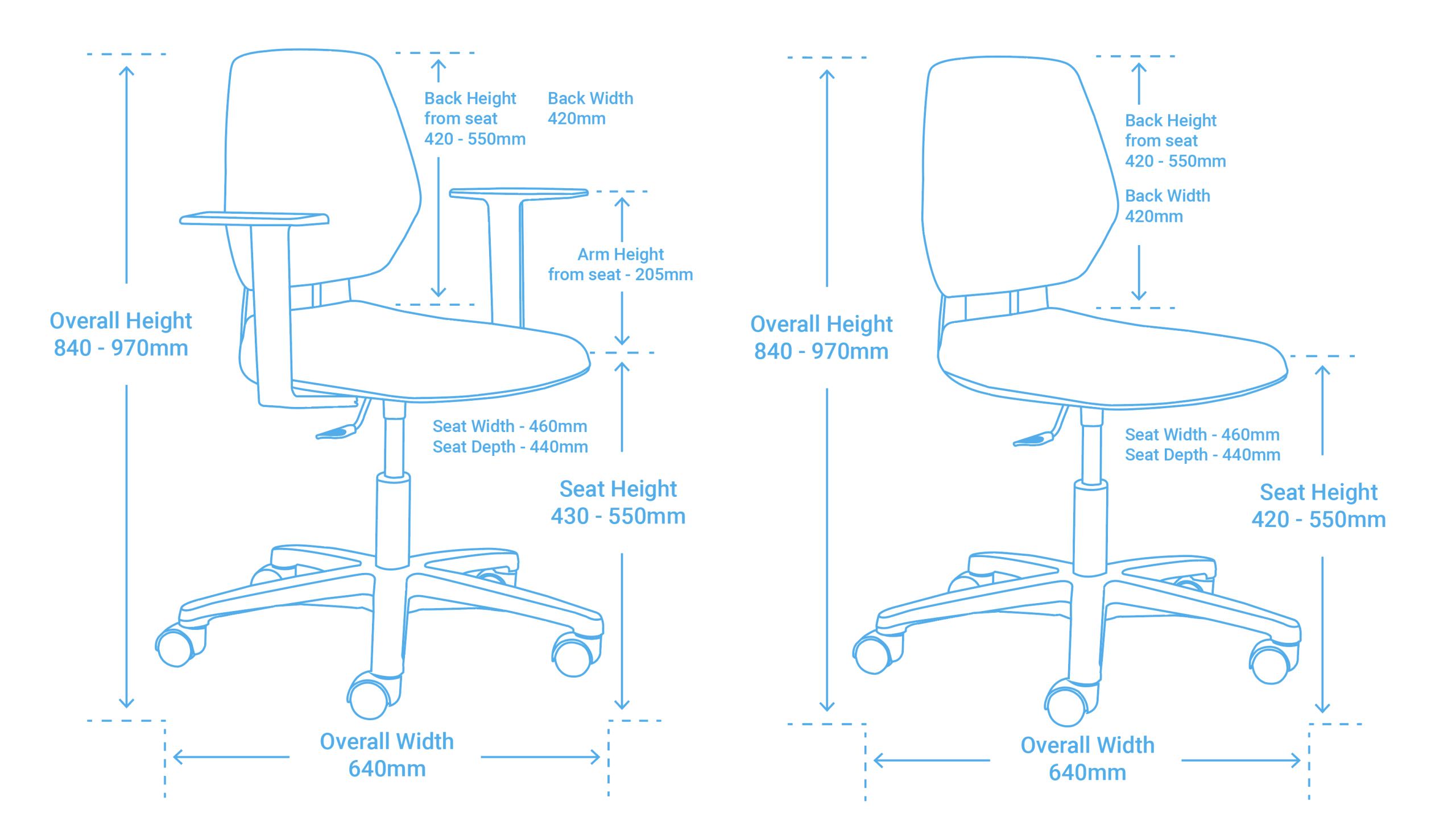 | Dimensions | 840-970mm (H) x 640mm (W) x 640mm (D) Seat Height: 420-550mm |