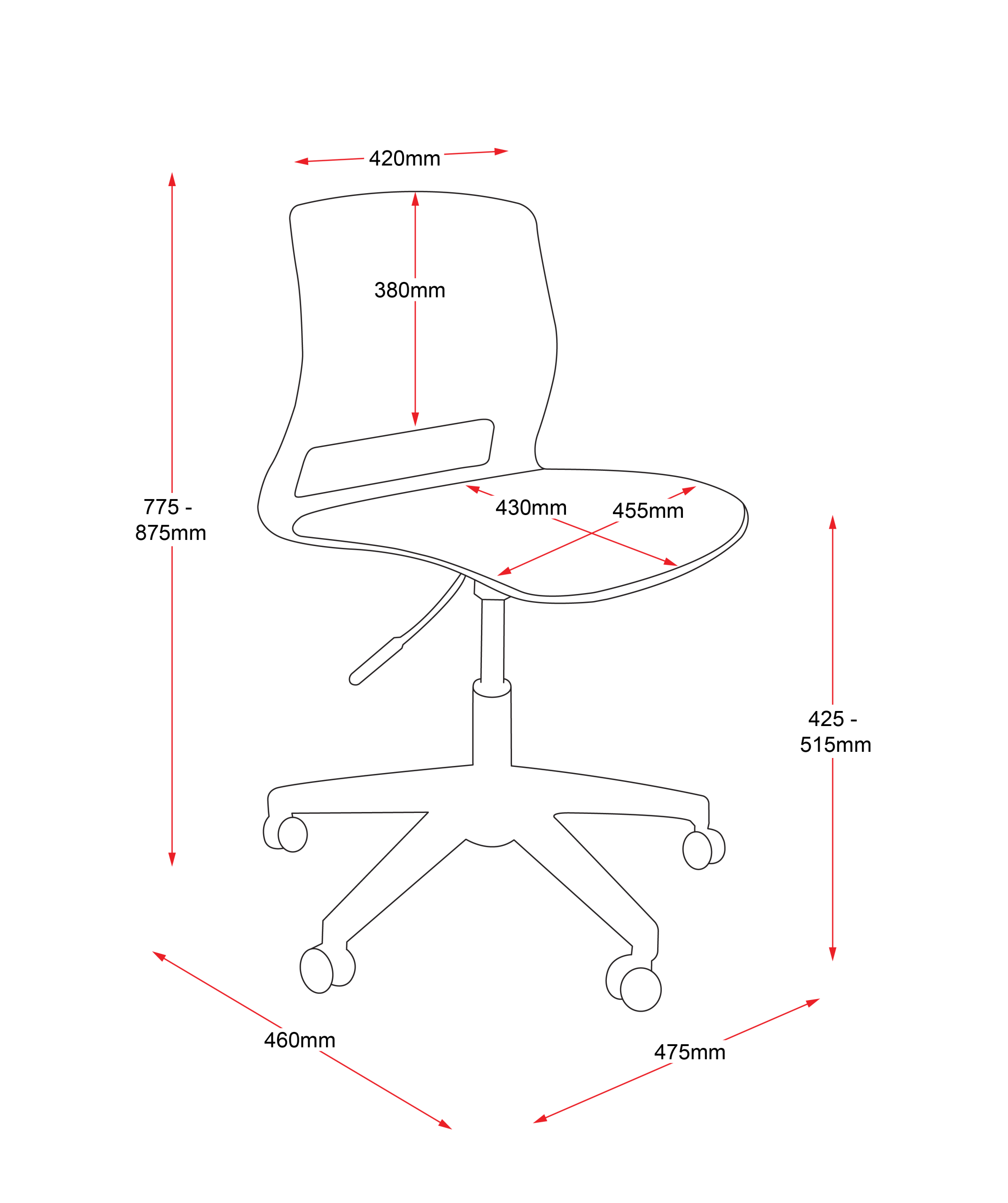 | Dimensions | 475mm W x 460mm x 775mm - 875mm H Seat height: 425mm - 515mm |