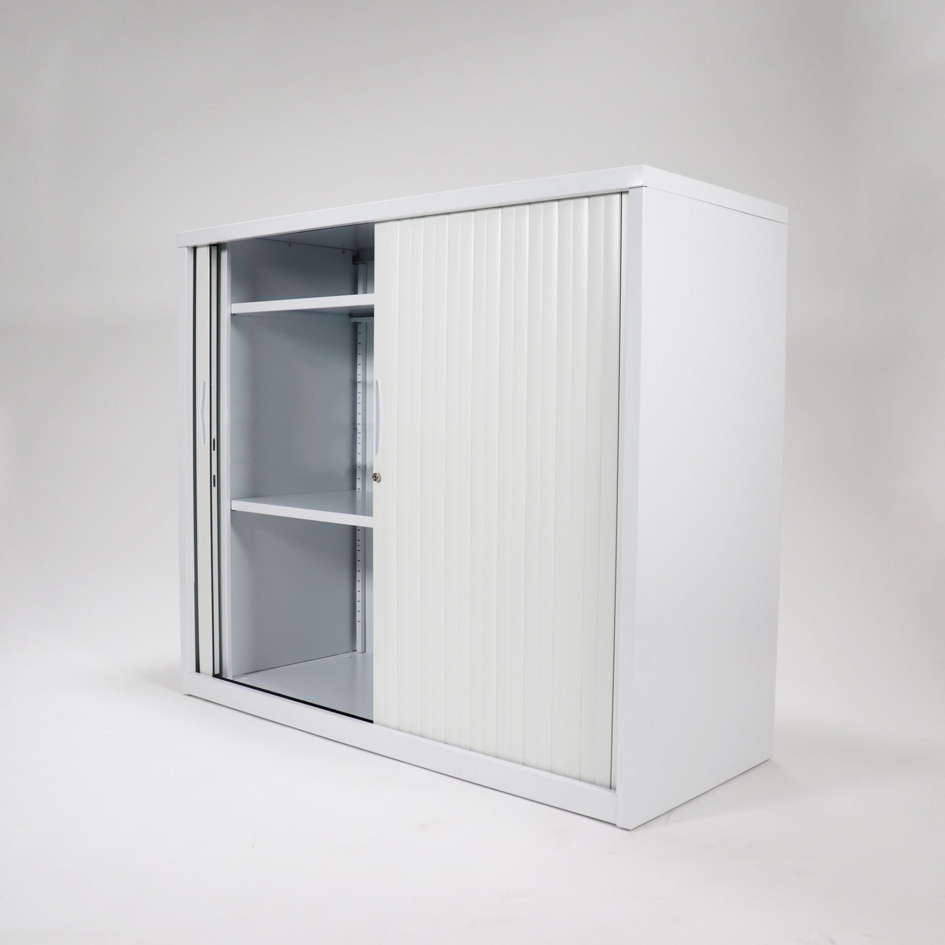 The 1200mm Wide Go Tambour door cupboard needs no space to open doors, saving valuable floor space and can fit easily into a workstation layout with a range of heights.